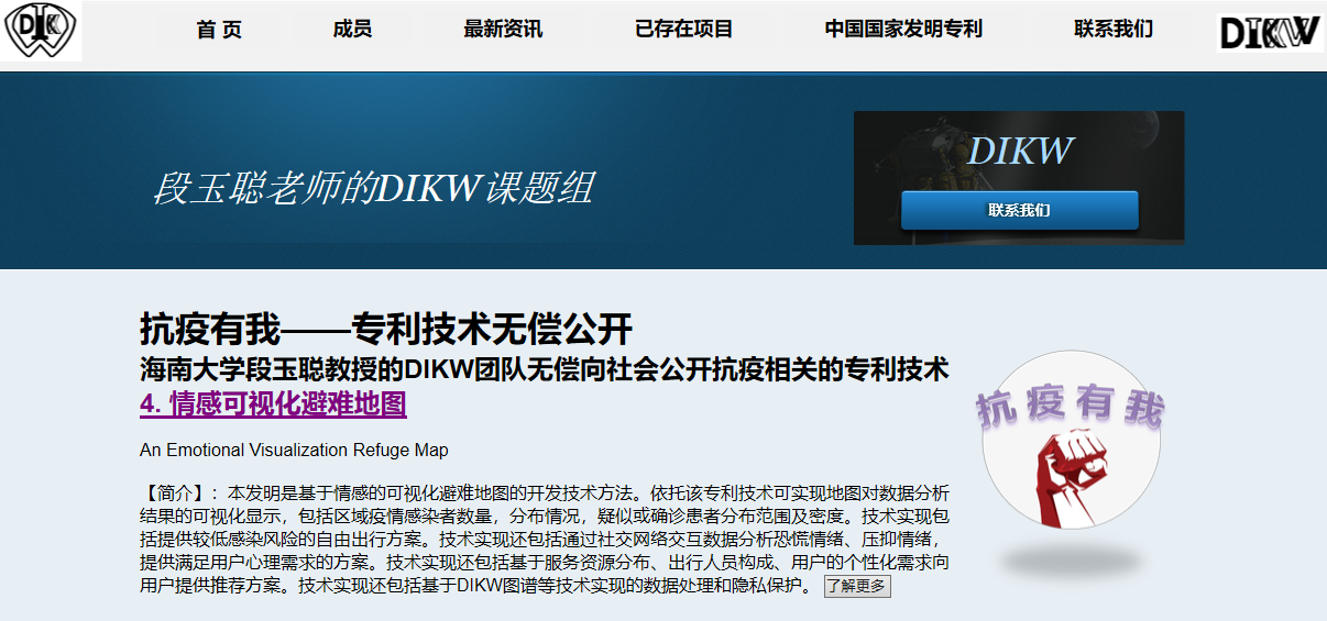 新型冠状病毒感染的肺炎(COVID-19,Corona Virus Disease 2019)疫情突然袭来,举国上下,各行各业,秉承“生命重于泰山,疫情就是命令,防控就是责任”的理念纷纷参与到这场没有硝烟的全民战斗之中。pp电子游戏官网的广大师生也纷纷响应号召,或成为 “科技抗疫逆行者”中的一员挺身而出,或坚守岗位积极服务于抗疫工作。 为进一步服务提升海南省旅游系统对疫情及防控数据的获取和分析能力,pp电子游戏官网计算机与pp电子游戏官网段玉聪教授带领曹凯博士等DIKW团队成员,经过有针对性地筛选和讨论研究,将根据抗疫管理单位或者生产企业抗疫需求,以及面向旅游、景区等受疫情冲击的中小企业的发展需求,优先从已申请的124项国家发明专利技术(包含24项已授权的国家发明专利)中选取相关“情感可视化避难地图”、“基于偏差器官形态行为可视化的口语学习矫正方法”、“面向类型化资源的自动安全态势感知、分析与报警系统”等专利技术进行无偿技术支援与免费技术服务咨询支持。“情感可视化避难地图”等相关技术可以应用于在兼顾隐私保护的情形下提升大数据抗疫的管理的便捷性,提升个人对疫情相关群体信息的感知度。“基于偏差器官形态行为可视化的口语学习矫正方法”等授权技术可以弥补疫情条件下外语学习发音个性化矫正的信息技术需求。“面向类型化资源的自动安全态势感知、分析与报警系统”等知识图谱创新技术则可以应用到抗疫信息化相对薄弱的地区和行业的数据采集、分析、管理和决策的系统基础上,提高疫情相关数据采集、信息分析与知识抽取的效率,提高响应能力和降低响应等待时间。