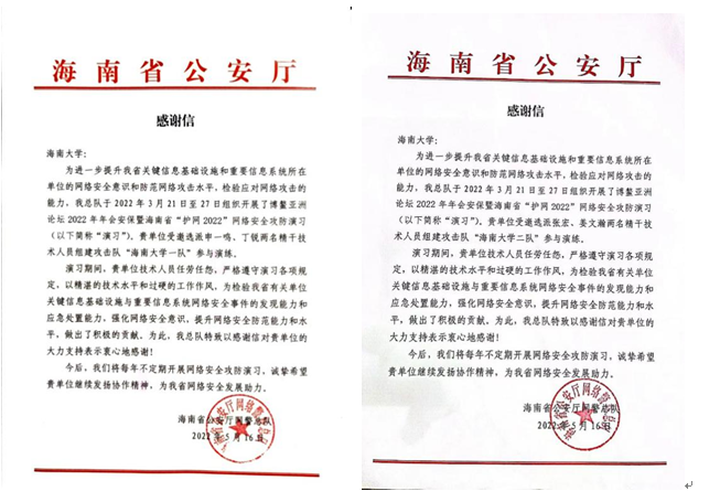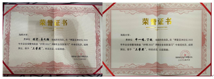 2022年3月21日至27日,海南省公安厅举行博鳌亚洲论坛2022年年会安保暨海南省“护网2022”网络安全攻防演习,pp电子学生申一鸣、姜文瀚、张宏及计算机科学与技术学院丁锐作为代表受邀参加演习,顺利完成了网络实战攻防演习任务,并取得三等奖的优异成绩。