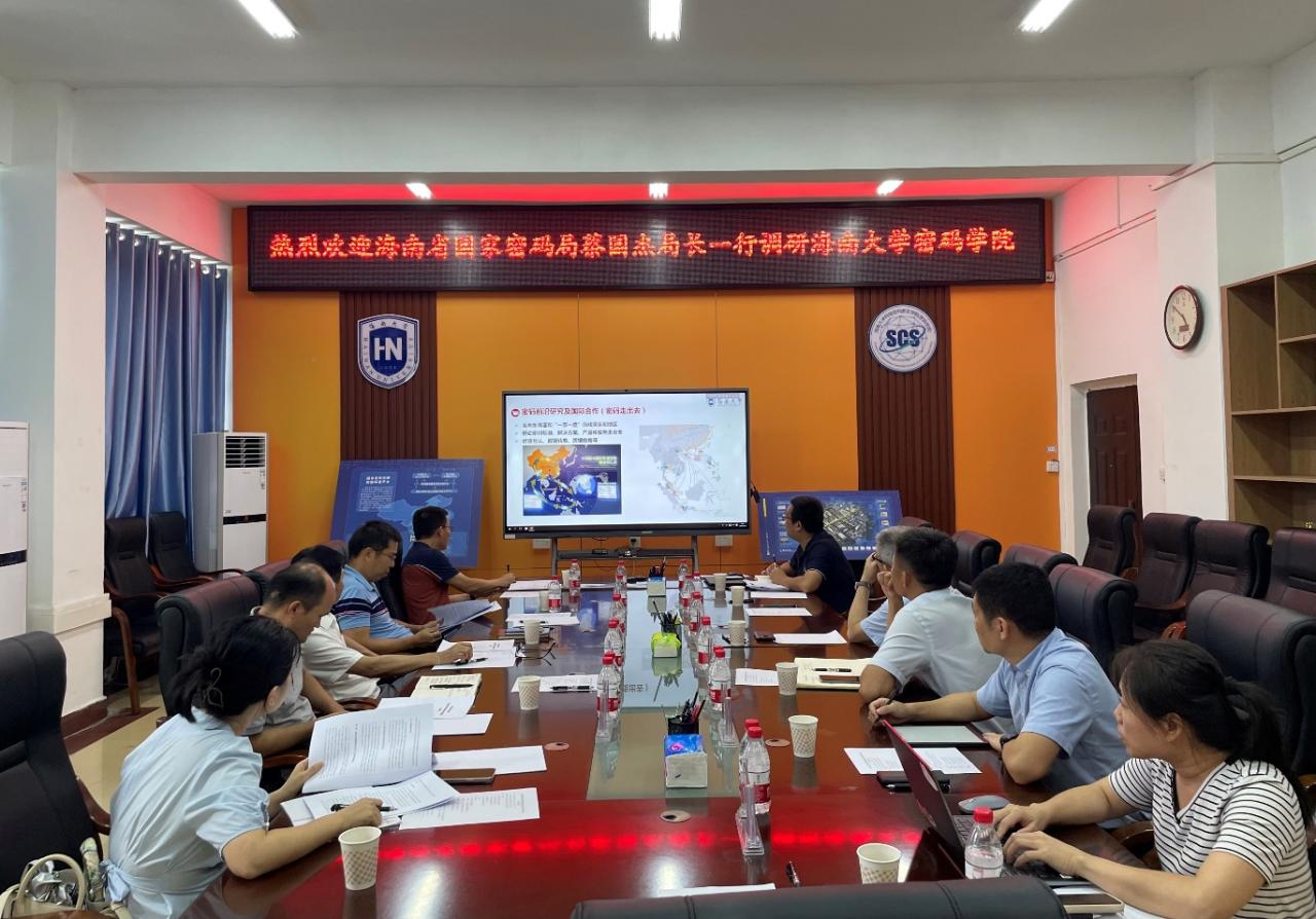 在pp电子游戏官网党委常委、副校长邱锡光,学院党总支书记陈广锐、执行院长曹春杰的陪同下,蔡国杰局长一行参观了pp电子游戏官网密码科普展厅,听取了pp电子游戏官网密码学院建设汇报和海南省商用密码协会成立大会筹备情况汇报。