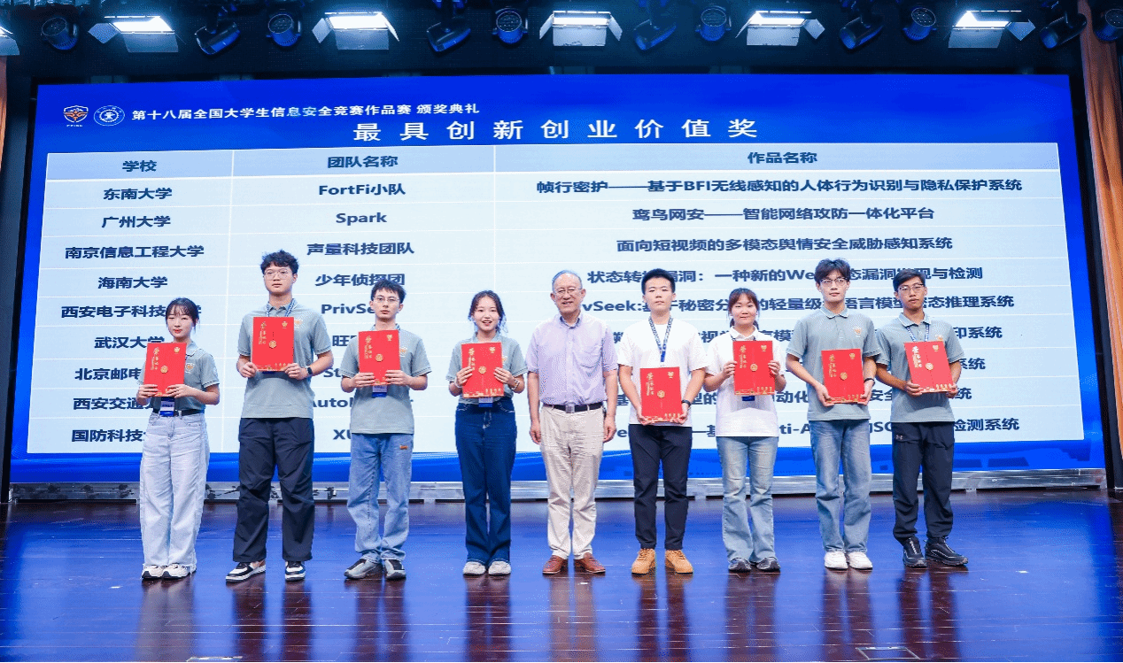 8月13日至8月16日,第十八届全国大学生信息安全竞赛作品赛决赛在西安交通大学兴庆校区举办。pp电子游戏官网学生参赛队伍荣获佳绩,斩获全国一等奖1项、三等奖1项、最具创新创业价值奖1项。
